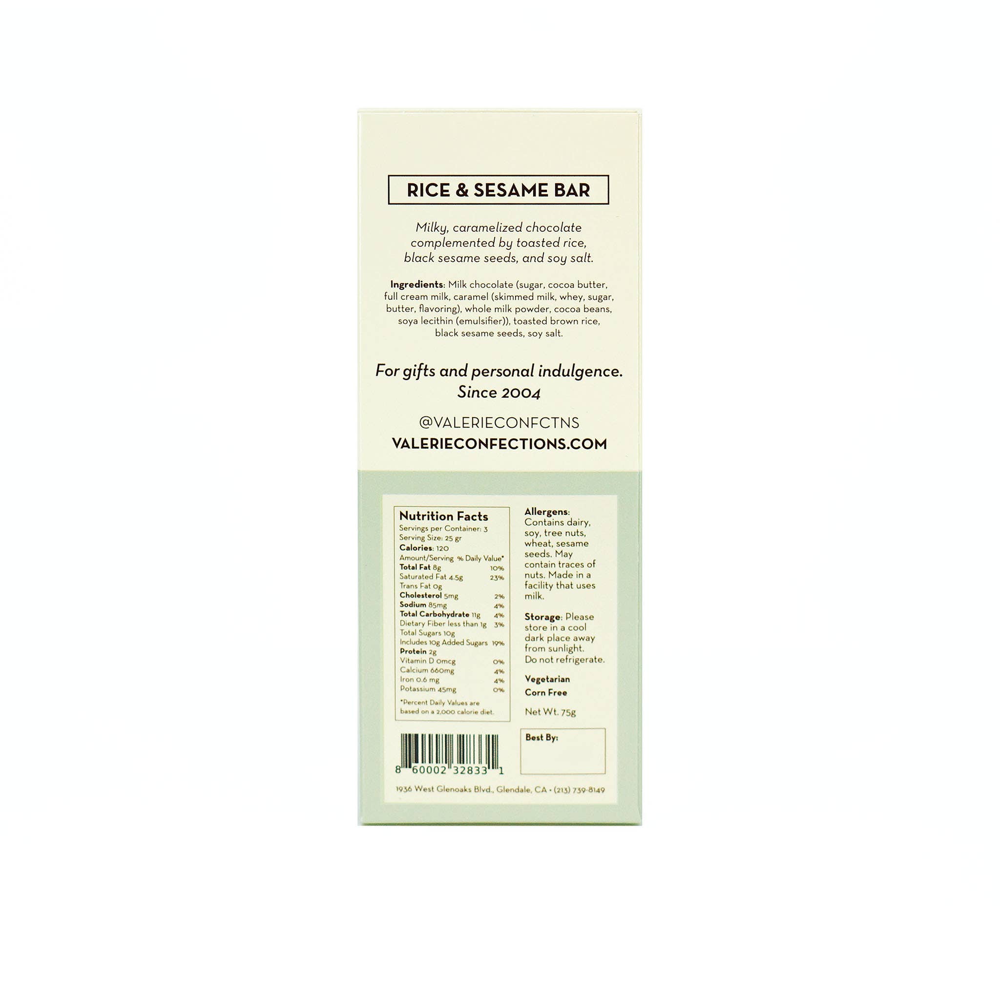 Darkened milk chocolate blended with toasted rice, black sesame, and a hint of soy salt. A sweet-savory bar with texture and nuance. A standout for design shops, specialty grocers, and chocolate sections seeking something bold and unique.